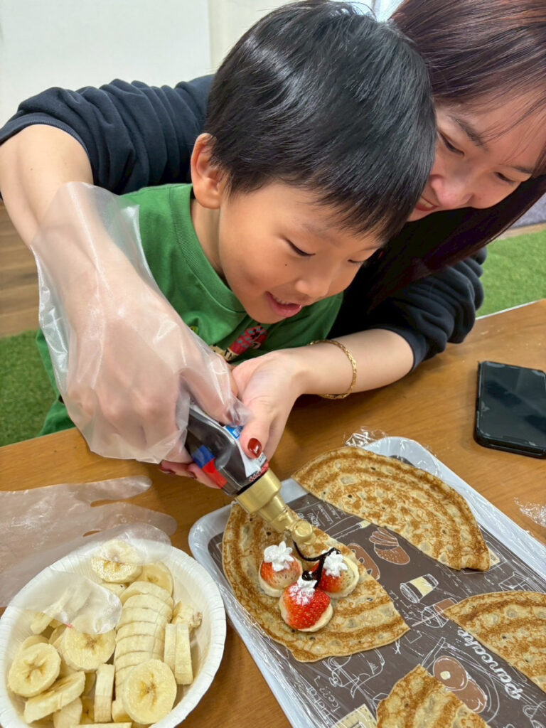 昨日今日と午前中の時間にクレープ作りを行いました!! 自分でバナナやイチゴ、生クリーム、チョコソースを トッピングしてオリジナルのクレープを作りました☺️